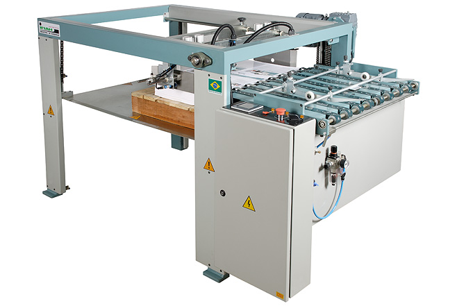O empilhador automatico deo folhas STACKER aumenta a produtividade de linhas impressoras automáticas ou semi-automáticas. As folhas são empilhadas diretamente sobre o pallet, facilitando o manuseio para a expedição ou para as outras operações de acabamento. Funciona de modo independente e sem necessidade de acoplamento a esteira do forno